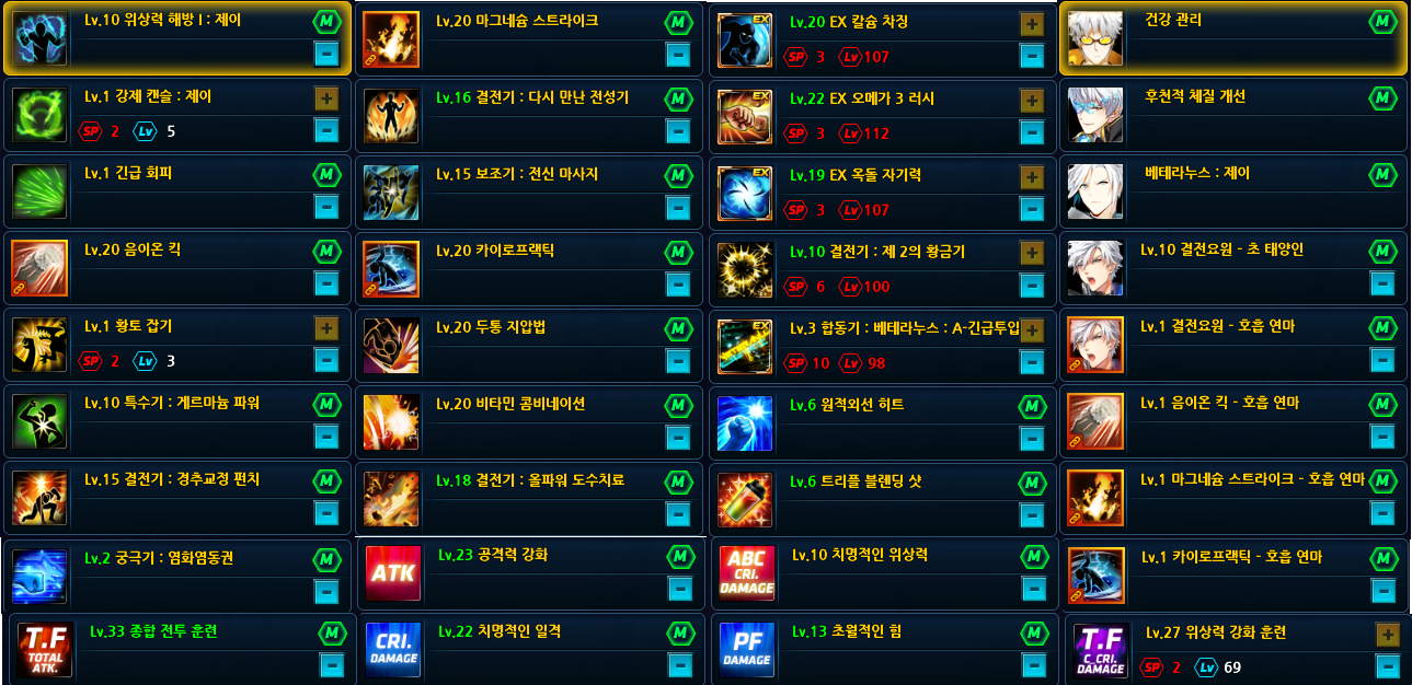 1-1. 스킬 포인트의 분배 강제캔슬 1~10, 황토 잡기 1 or 10 or M, 결전기 : 경추교정 펀치 2 or 6 or M 위의 스킬들을 취향대로 분배 후, 남은 스킬 포인트는 위상력 강화 훈련에 분배해주세요.